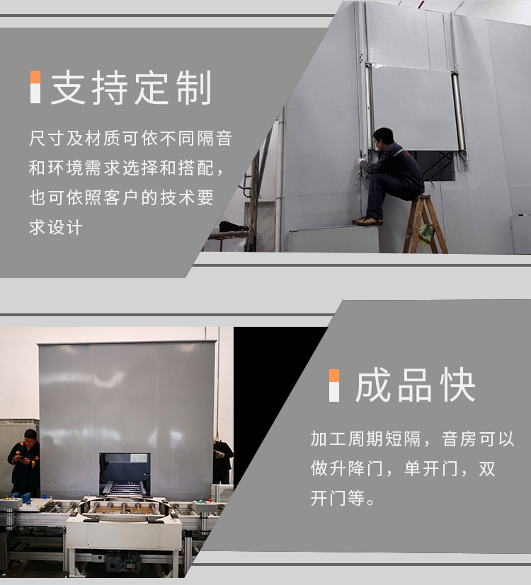 5、静音房成品收集面可设计设置升降门,采用轻型材料制作,采用电机驱动、机械传动升降,升降动作连锁保护,并设置安全保护装置和声光报警器,确保操作人员的安全;